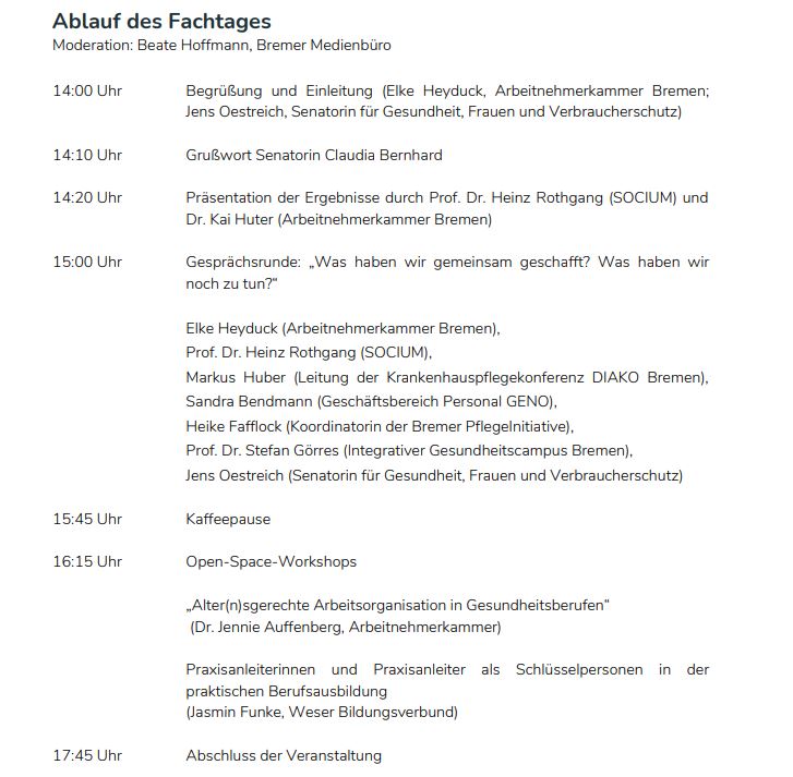 Die Veranstaltung wird von der Senatorin für Gesundheit, Frauen und Verbraucherschutz gemeinsam mit der Arbeitnehmerkammer Bremen und der Bremer PflegeInitiative ausgerichtet. Wir möchten mit Ihnen in den fachlichen Austausch gehen zu den Ergebnissen, zu ergriffenen Maßnahmen und zu notwendigen Schritten für die kommenden Jahre.