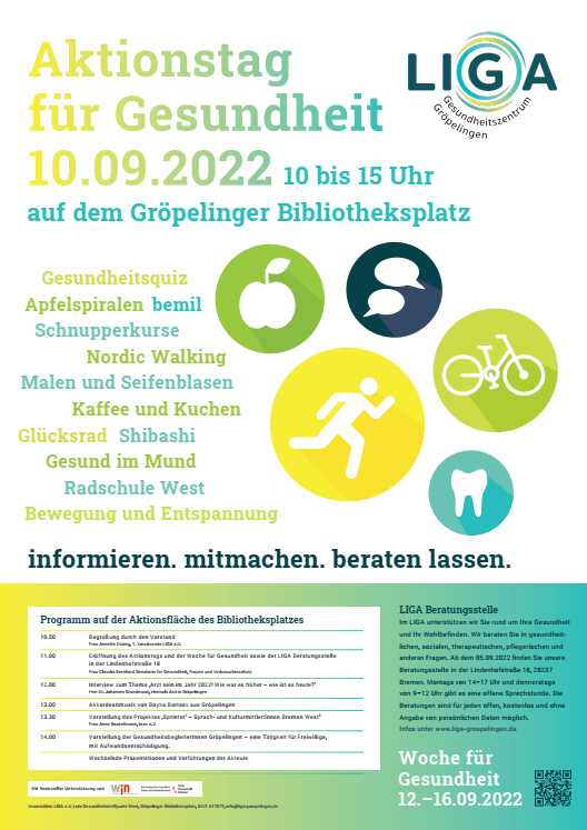 Wir freuen uns auf Sie/auf Euch zum Aktionstag am 10.09. von 10 – 15 Uhr auf dem Gröpelinger Bibliotheksplatz und über viele weitere Besucher:innen. Und, bitte informieren Sie/informiert alle Interessierten über die dezentralen Veranstaltungen in Gröpelingen während der Woche für Gesundheit vom 12.-16. 09.2022 und über die LIGA Beratungsstelle.