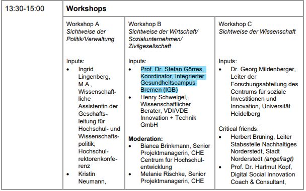 Um 13.30 im Workshop B stellt Prof. Dr. Stefan Görres den Integrierten Gesundheitscampus Bremen als mögliche Blauphase für DATI vor